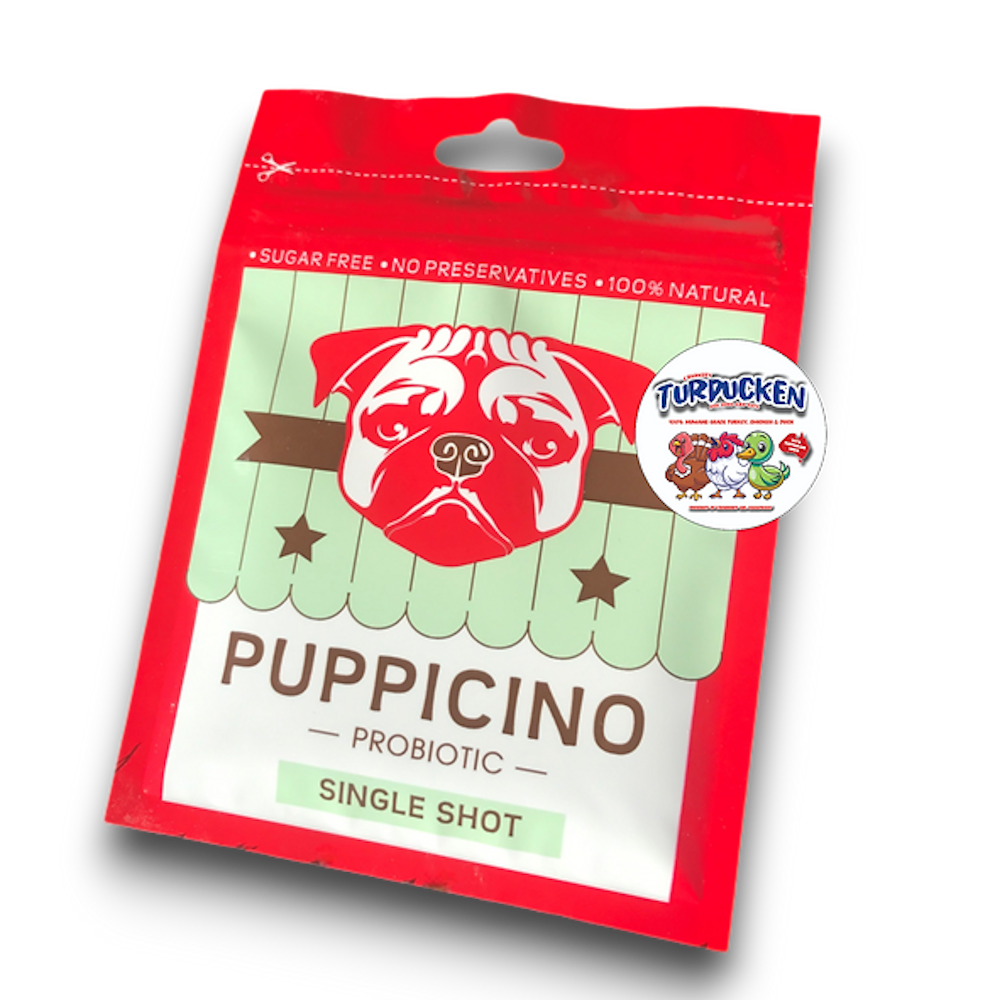 Turducken Puppicino, all the goodness of our Probiotic Original Puppicino BUT with Australian Human Grade Chicken, Turkey, and Duck. Pack Sizes: Single Shot (1 Serve) Ingredients: condensed cultured skim milk, yogurt, maize... Read more