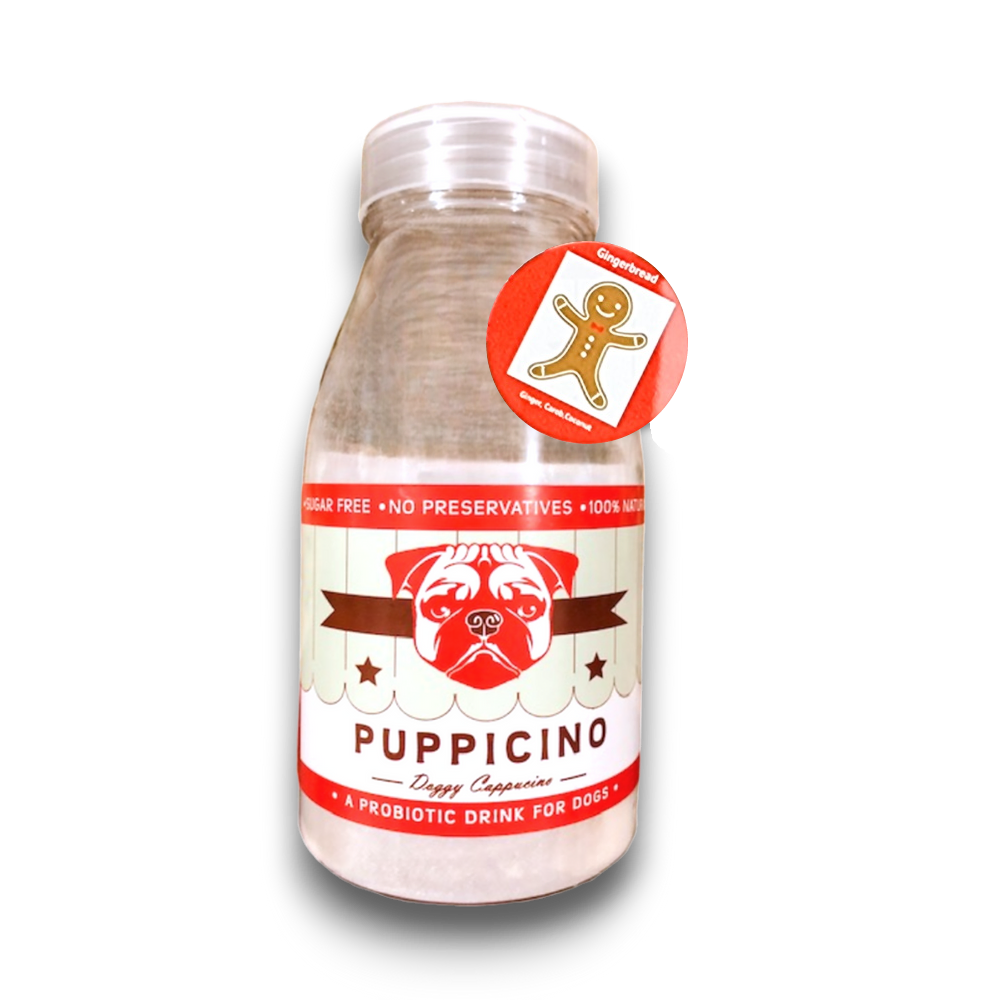Puppicino Gingerbread shaker bottle single serve for our fur kids! Original Puppicino with the goodness of carob, ginger and coconut!